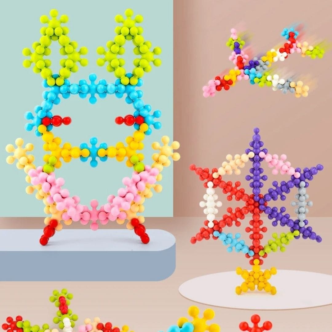 Chaque pièce en forme de flocon peut s’assembler dans toutes les directions, ouvrant un champ infini de constructions.