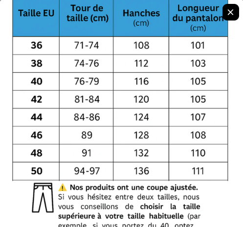 Si vous êtes entre deux tailles, nous vous recommandons de choisir la taille au-dessus pour un ajustement plus confortabl